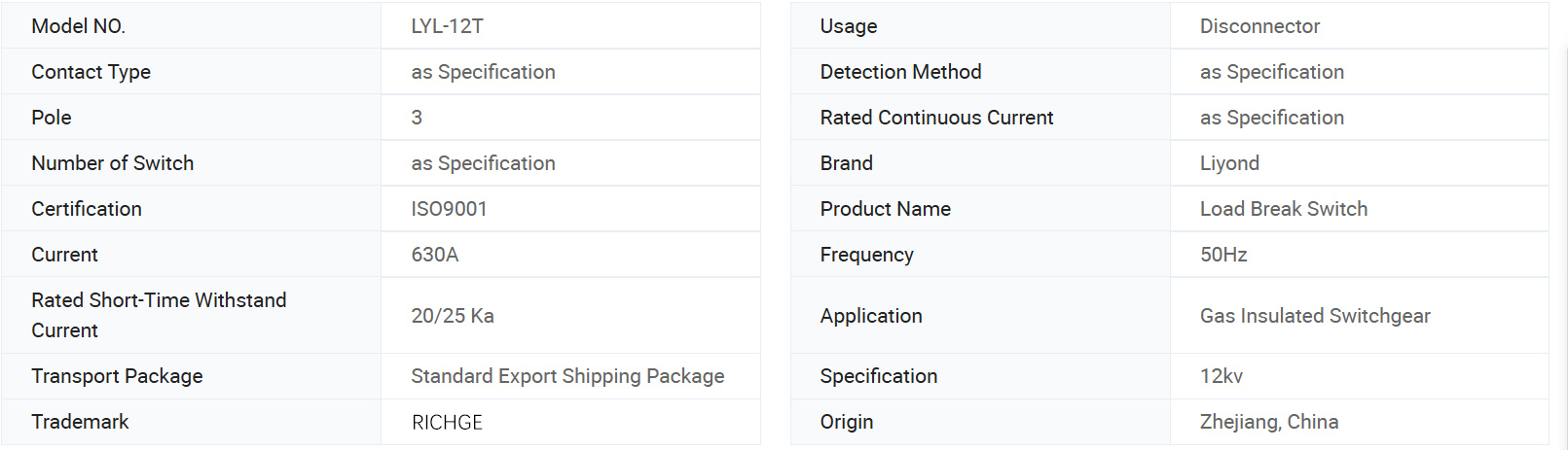 LYL-12T लोड स्विच GB3804-2004 "3.6kV~40.5kV हाय व्होल्टेज एसी लोड स्विच" आणि GB16926-1997 "AC हाय व्होल्टेज लोड स्विच-फ्यूज कॉम्बिनेशन ऍप्लिकेशन" च्या संबंधित आवश्यकतांचे पालन करते. मुख्य सर्किट: 630A-20kA (4s), 25kA (3s); यांत्रिक जीवन: 5000 वेळा; ग्राउंडिंग सर्किट: 20kA (2s); यांत्रिक जीवन: 2000 वेळा.