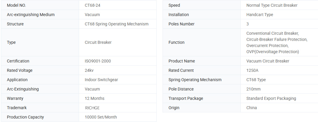 सीटी 68-24 व्हॅकम सर्किट ब्रेकर उच्च ब्रेकिंग क्षमतेसह आणि खूप लांब विद्युत सहनशक्तीसह विशेष संपर्क सामग्री आणि इंटरप्टरचा अवलंब करते.