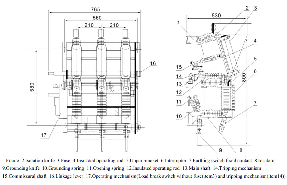 एफझेडएन 21-12 मालिका हाय-व्होल्टेज व्हॅक्यूम लोड स्विच मुख्यतः फ्रेमर, डिस्कनेक्टिंग स्विच (कॉम्बिनरचा वर्तमान-मर्यादित फ्यूज डिस्कनेक्टिंग स्विचमध्ये आहे), व्हॅक्यूम स्विचिंग ट्यूब, ग्राउंडिंग स्विच, स्प्रिंग ऑपरेटिंग यंत्रणा इत्यादी बनलेला आहे. या उत्पादनात कॉम्पॅक्ट स्ट्रक्चर, लहान व्हॉल्यूम, दीर्घ जीवन, मजबूत बंद आणि ब्रेकिंग क्षमता आणि सुलभ ऑपरेशन आणि देखभाल आहे. व्हॅक्यूम स्विच वसंत-संचालित यंत्रणेने सुसज्ज आहे, जो इलेक्ट्रिक मोटर (दुसरा मॅन्युअल) स्प्रिंग एनर्जी स्टोरेज स्वीकारतो आणि तेथे दोन प्रकारच्या बंद पद्धती आहेत: इलेक्ट्रोमॅग्नेट क्लोजिंग आणि मॅन्युअल स्प्लिटिंग आणि क्लोजिंग. गैरसमज रोखण्यासाठी डिस्कनेक्टिंग स्विच, व्हॅक्यूम स्विच आणि अर्थिंग स्विच एकमेकांशी (मेकॅनिकल इंटरलॉकिंग) इंटरलॉक केलेले आहेत.