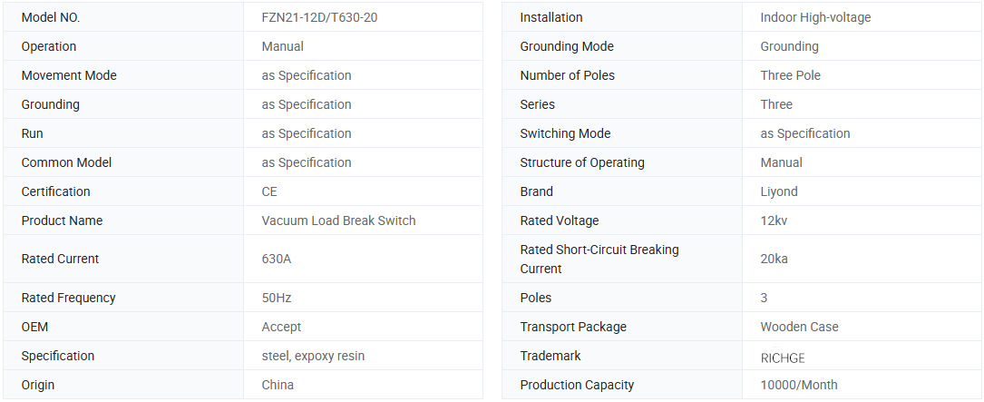 एफझेडएन 21-12/टी 630-20 आणि एफझेडएन 21-12 (आर) डी/टी 125-31.5 प्रकार इंडोर एसी उच्च व्होल्टेज लोड स्विच-फ्यूज कॉम्बिनेशन युनिट्स अप्लायन्स टू थ्री-फेज एसी 12 केव्ही, 5 ओएचझेड पॉवर सिस्टम आणि लूप-नेटवर्क स्विच कॅबिनेट, प्लॅफिक ट्यून्सिंग, आरंभिक वापर एंटरप्राइजेस, उच्च-वाढीव इमारती आणि सार्वजनिक सुविधा, रिंग पॉवर सप्लाय युनिट किंवा टर्मिनल उपकरणे, प्ले वीज वितरण, नियंत्रण आणि संरक्षण म्हणून वापरल्या जाऊ शकतात. उत्पादनांची तांत्रिक कामगिरी आयईसी प्रकाशन 60265-1/एफडीआयएस << उच्च व्होल्टेज स्विच, भाग 1: 52 केव्हीपेक्षा कमी रेट व्होल्टेज उच्च व्होल्टेज लोड स्विच >>, आयईसी 60420 << उच्च व्होल्टेज एसी लोड स्विच - फ्यूज कॉम्बिनेशन युनिट्स >>; आणि सीबी 1 926 << एसी उच्च-व्होल्टेज लोड स्विच-फ्यूज कॉम्बिनेशन युनिट्स >>, जीबी 3804 << 3-63 केव्ही एसी उच्च व्होल्टेज स्विच >> नियमित.