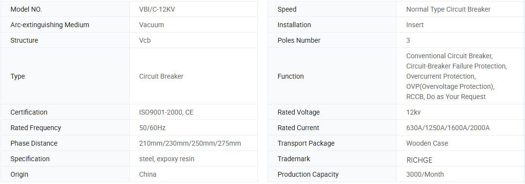व्हीबीआय -12 मध्यम व्होल्टेज व्हॅक्यूम सर्किट ब्रेकर हा एक प्रकारचा इनडोअर मध्यम व्होल्टेज स्विच उपकरणे आहे जो 50 हर्ट्ज/60 हर्ट्ज थ्री फेज एसी 12 केव्ही रेट केला आहे. व्होल्टेजव्हीबीआय प्रकार व्हॅक्यूम सर्किट ब्रेकर राष्ट्रीय मानक जीबी 1984-2003 एचव्ही व्हॅक्यूम सर्किट ब्रेकर, जेबी 3855-1996<3.6-40.5kV indoor AC high voltage vacuum circuit breaker>, डीएल/टी 403-2000<12kv-40.5kv HV vacuum circuit breaker ordering technical conditions>, आणि आयईसी 62271-100: 2001 उच्च व्होल्टेज एसी सर्किट ब्रेकर संबंधित नियम. व्हीबीआय उच्च व्होल्टेज व्हॅक्यूम सर्किट ब्रेकर 12 केव्ही किंवा 24 केव्ही पॉवर सिस्टम इनडोअर स्विचिंग इक्विपमेंटसाठी वापरला जातो