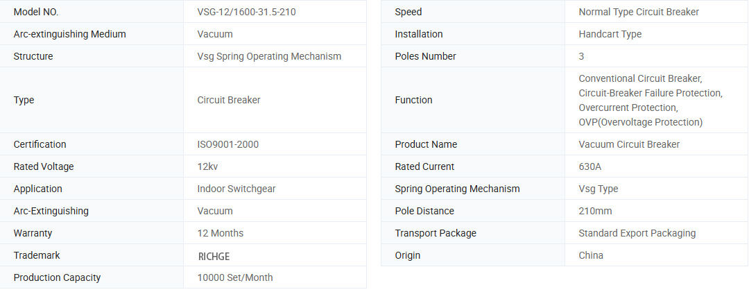व्हीएसजी -12 प्रकार इनडोअर हाय व्होल्टेज व्हॅक्यूम सर्किट ब्रेकर स्प्रिंग टू स्टोरेज एनर्जीचा वापर केला. ऑपरेटिंग यंत्रणा दोन मार्गांनी चालविली जाऊ शकते, मॅन्युअल आणि इलेक्ट्रोमोटिव्ह ऑपरेशनद्वारे, वैशिष्ट्ये जीबी 1984-2003 उच्च व्होल्टेज एसी सर्किट ब्रेकर, जेबी 3855-1996 3.6-4.5 केव्ही इंडोर एसी उच्च व्होल्टेज एसी सर्किट ब्रेकर आणि आयईसी मानक 62271-100: 20016271