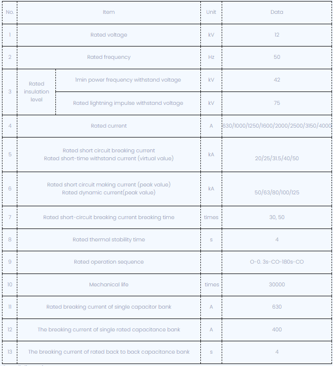 व्हीएसजी -12 2000 ए व्हॅक्यूम सर्किट ब्रेकर तांत्रिक पॅरामीटर्स