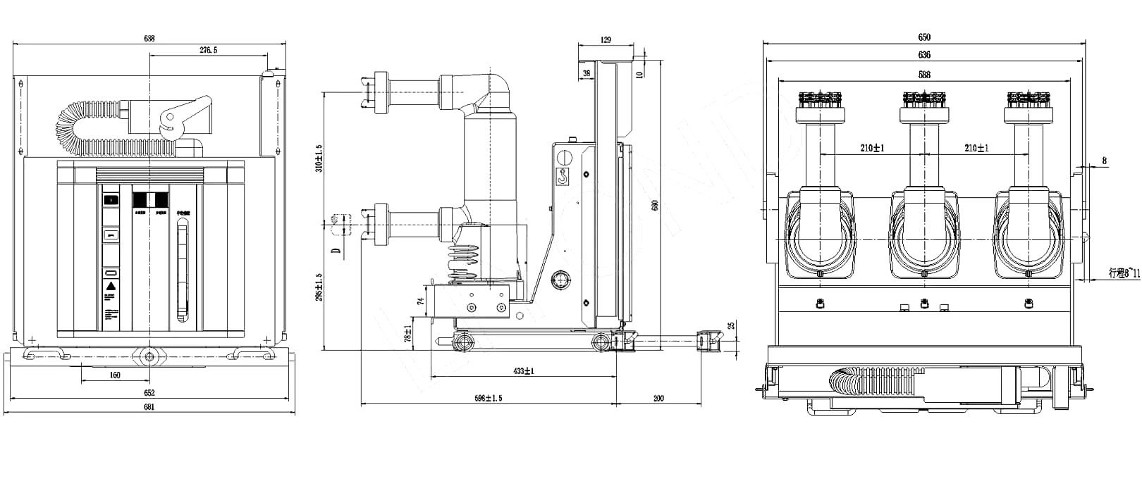 निश्चित ध्रुवासह व्हीएसजी -12/2000 ए हँडकार्ट प्रकार व्हॅक्यूम सर्किट ब्रेकरचे परिमाण